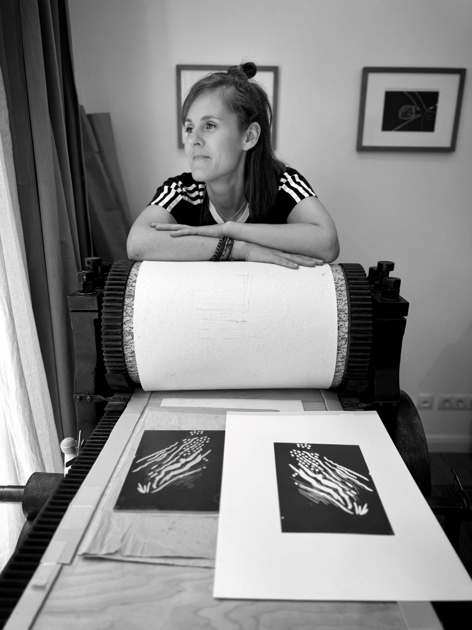 Hier wird an einer über hundert Jahren alten Druckwalze gearbeitet. Die Künstlerin zeigt den handwerklichen Prozess und veranschaulicht die Entstehung einer Postkarte.